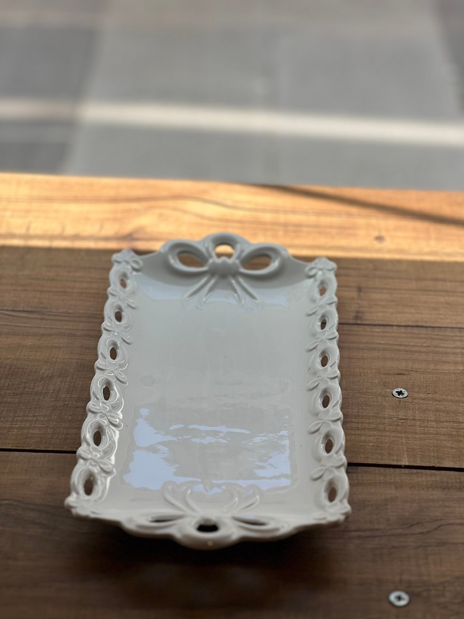Aportá un toque clásico y refinado con la bandeja de porcelana Mono, de forma rectangular y delicado labrado. Su diseño elegante y acabado brillante la convierten en una pieza ideal para servir, decorar o presentar con estilo.