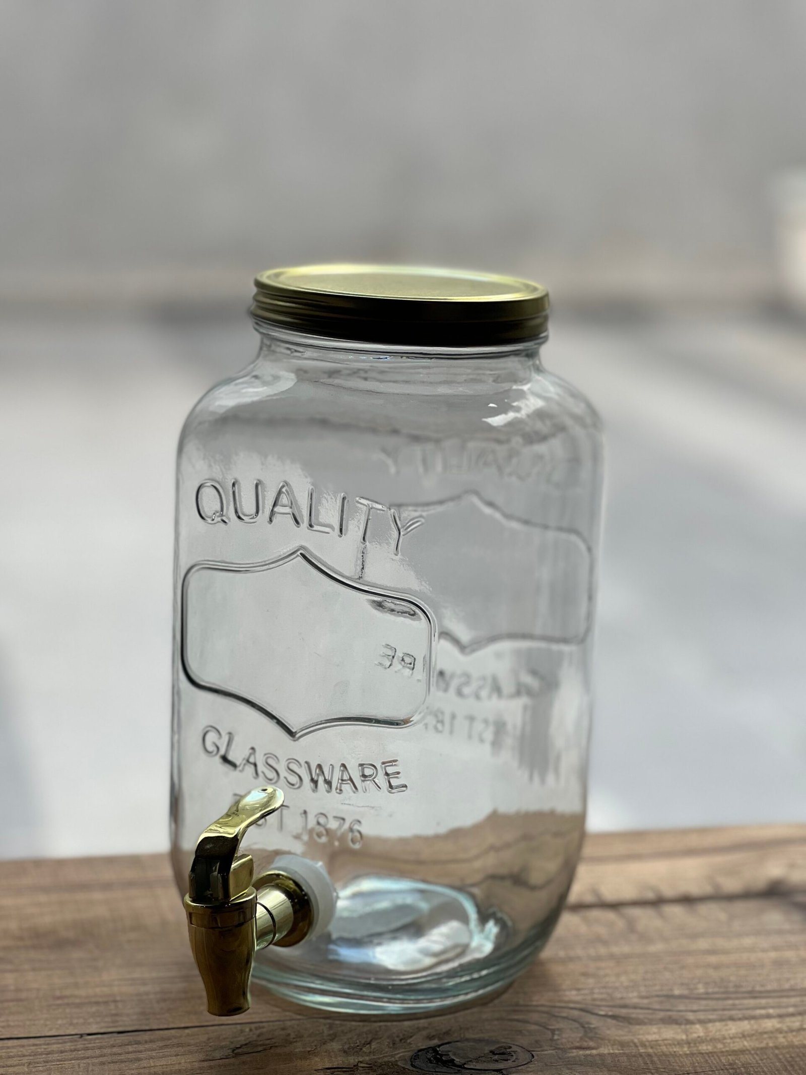 Práctico frasco dispenser de vidrio con canilla, tapa dorada y pico vertedor dorado, ideal para servir bebidas frías con comodidad y estilo. Perfecto para reuniones, fiestas o el hogar.