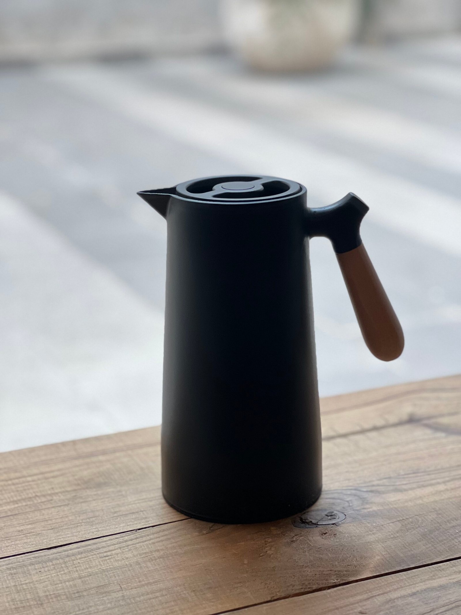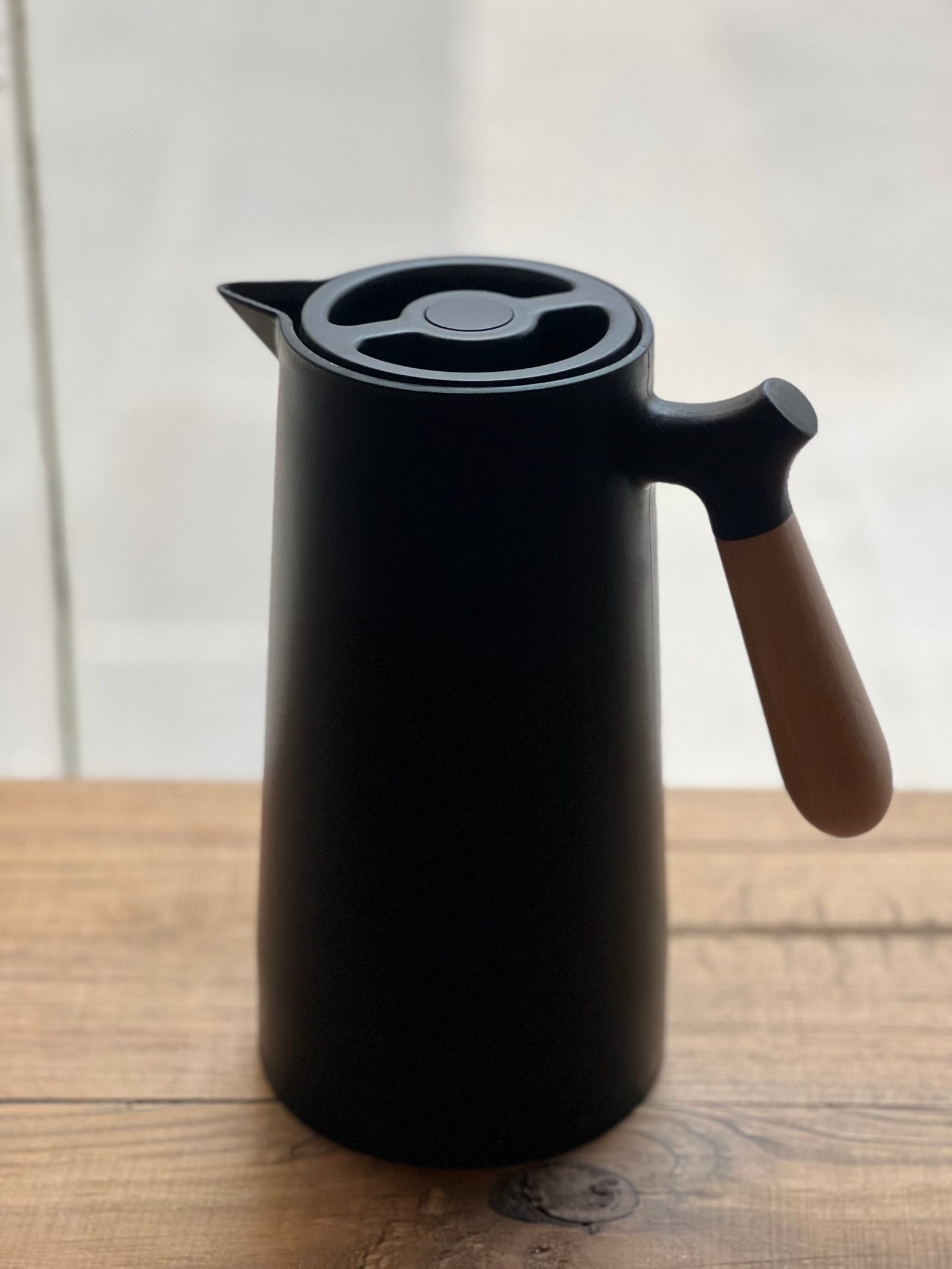 Práctica y elegante jarra térmica negra con asa de bambú, ideal para mantener tus bebidas calientes por más tiempo. Perfecta para el hogar, oficina o reuniones, combina funcionalidad y estilo natural.