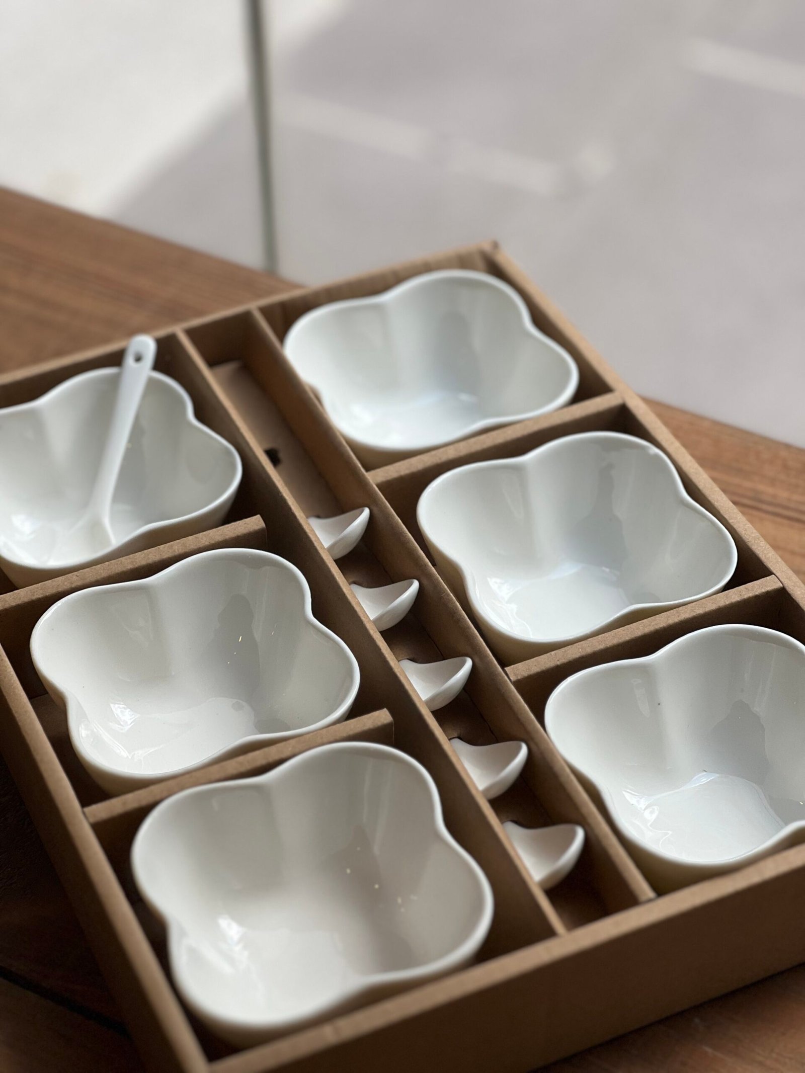Elegante set de 6 copetineros de porcelana, cada uno acompañado de su cucharita. Ideal para servir salsas, condimentos o acompañamientos con estilo y funcionalidad en la mesa.